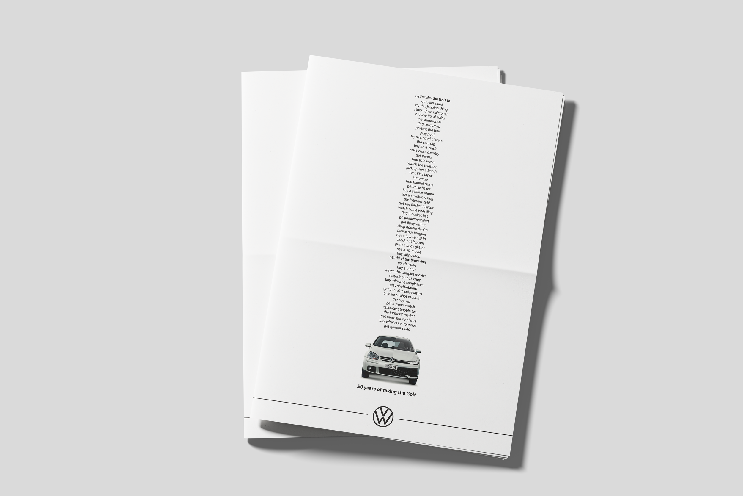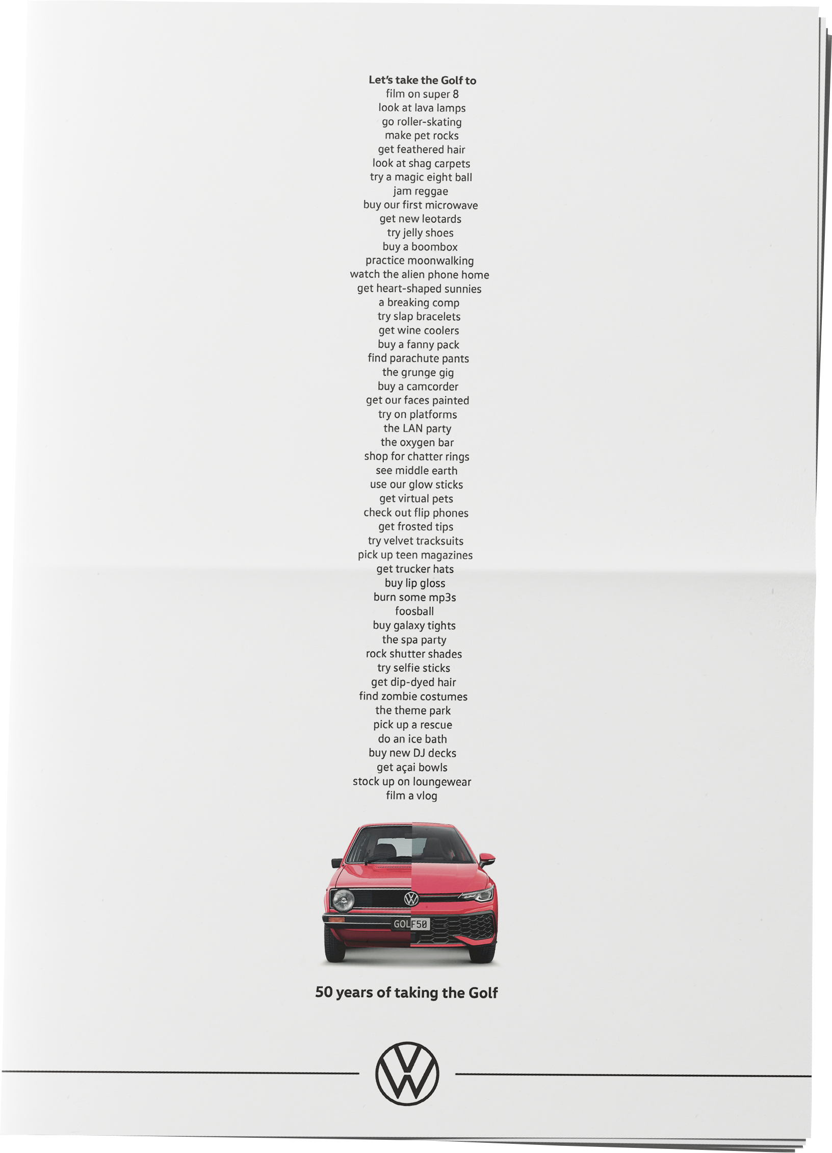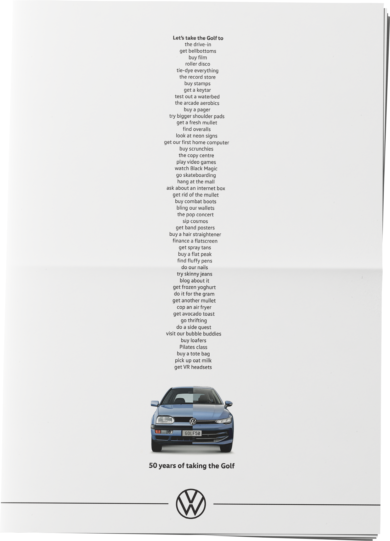 To celebrate 50 years of the first hot hatch, we created a print campaign to show just how much the Golf has seen. Whether you’ve gone to get a perm, to roller disco, to the farmers’ market, or just to get some avo toast;